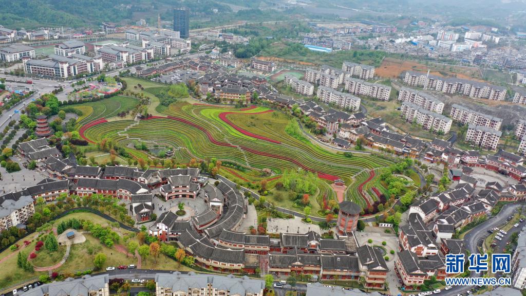 4月14日拍攝的貴州省畢節市大方縣國家4A級景區——奢香古鎮梯田(無人機照片)。暖春時節,位于貴州省畢節市大方縣奢香古鎮里的梯田色彩斑斕、春意盎然,吸引不少游客前來賞景游玩。新華社記者 楊楹 攝