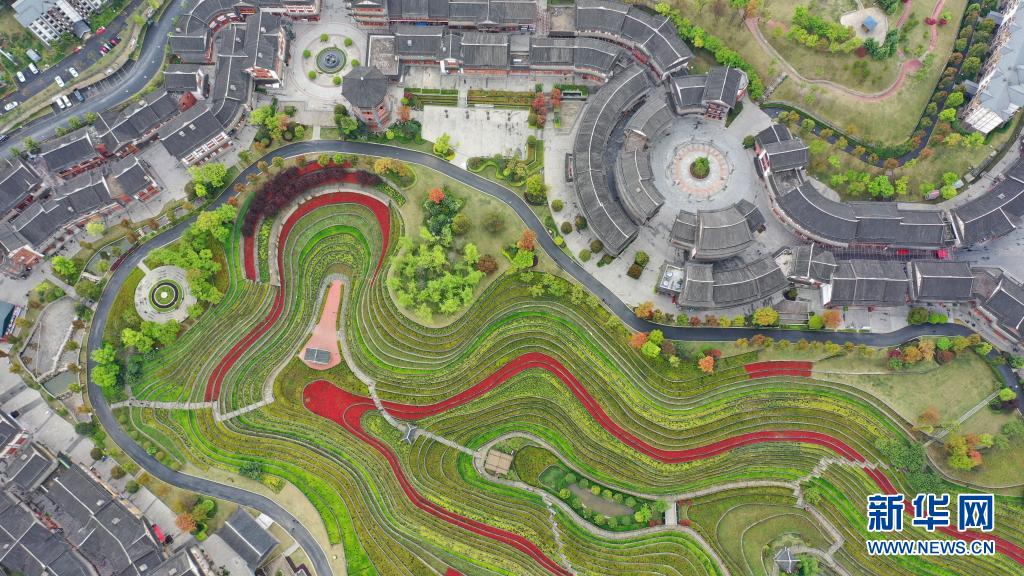 4月14日拍攝的貴州省畢節市大方縣國家4A級景區——奢香古鎮梯田(無人機照片)。暖春時節,位于貴州省畢節市大方縣奢香古鎮里的梯田色彩斑斕、春意盎然,吸引不少游客前來賞景游玩。新華社記者 楊楹 攝