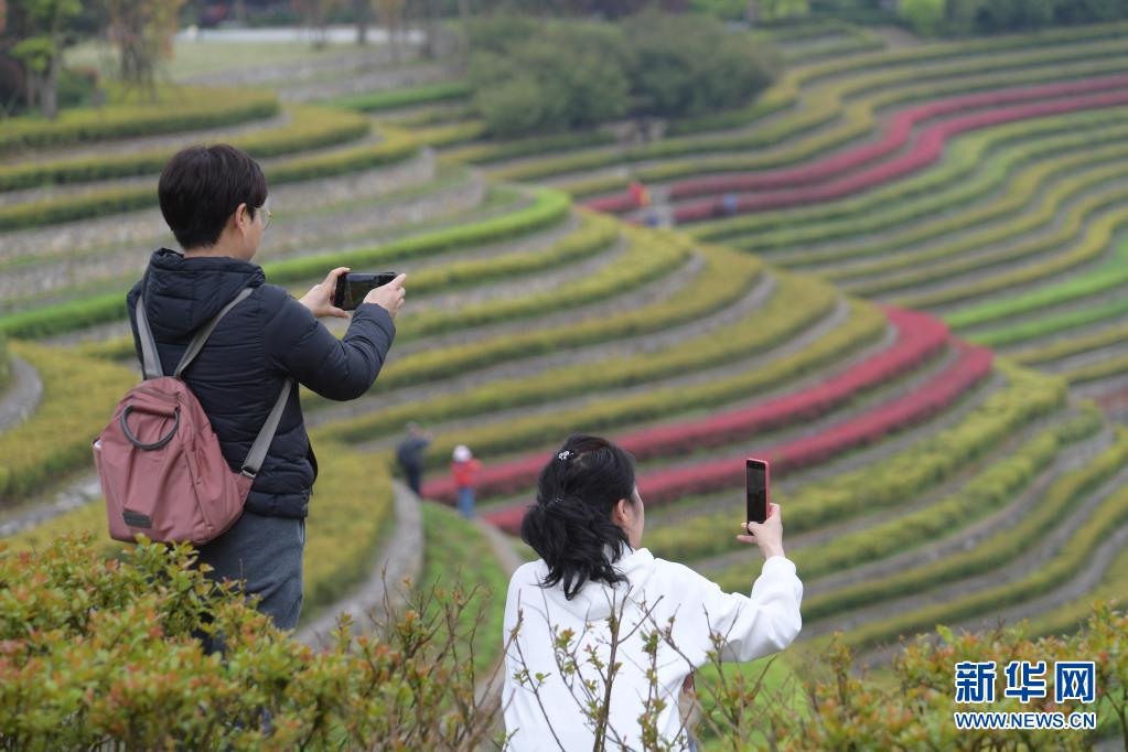 4月14日,游客在貴州省畢節市大方縣國家4A級景區——奢香古鎮梯田游玩。暖春時節,位于貴州省畢節市大方縣奢香古鎮里的梯田色彩斑斕、春意盎然,吸引不少游客前來賞景游玩。新華社記者 楊楹 攝