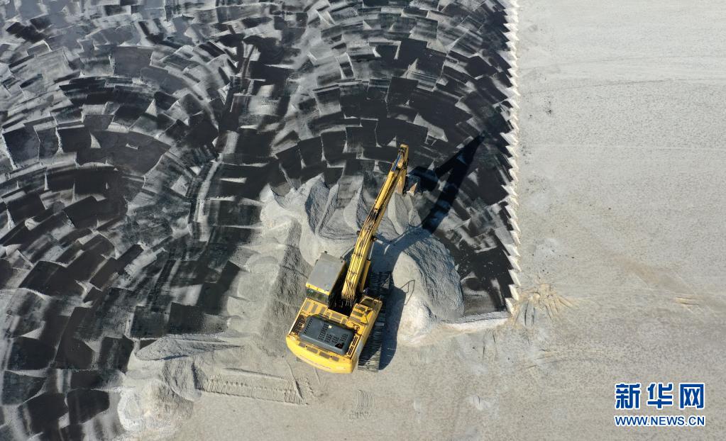 4月13日,大型機(jī)械在天津長(zhǎng)蘆漢沽鹽場(chǎng)的鹽池中作業(yè)(無人機(jī)照片)。