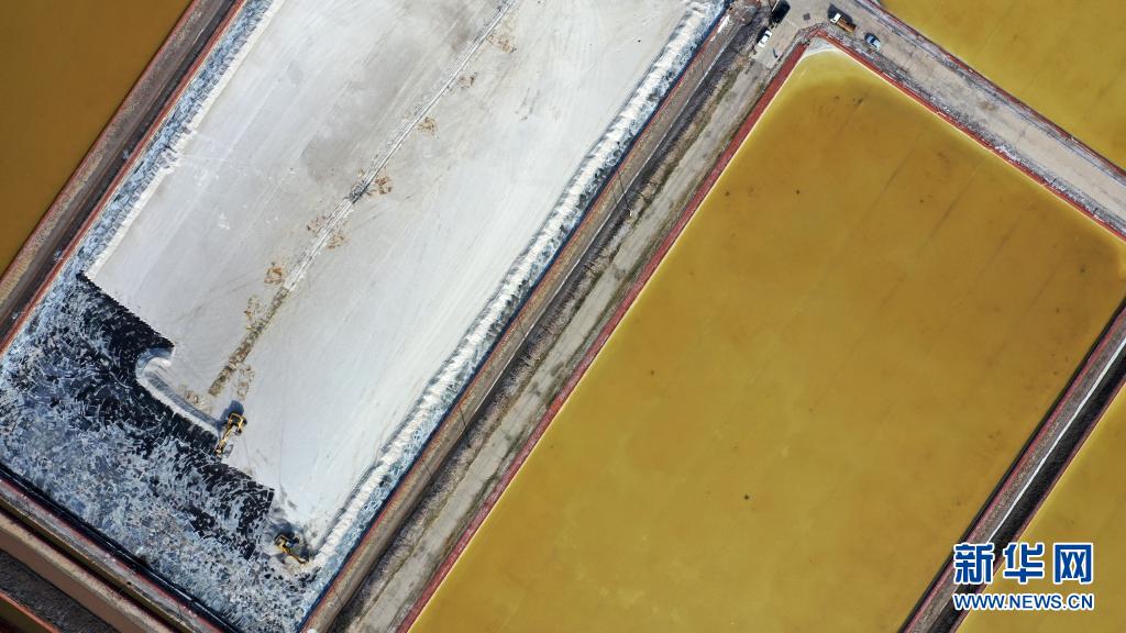 4月13日,大型機械在天津長蘆漢沽鹽場的鹽池中作業(yè)(無人機照片)。