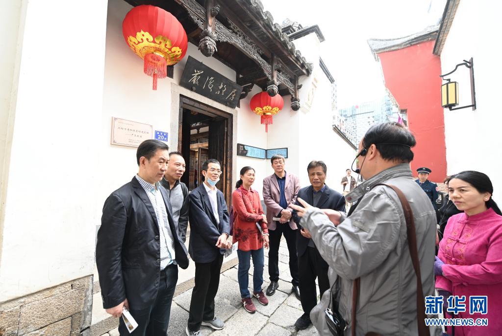 4月18日,游客在福州三坊七巷郎官巷的嚴(yán)復(fù)故居前聽(tīng)講解員介紹郎官巷的舊事。