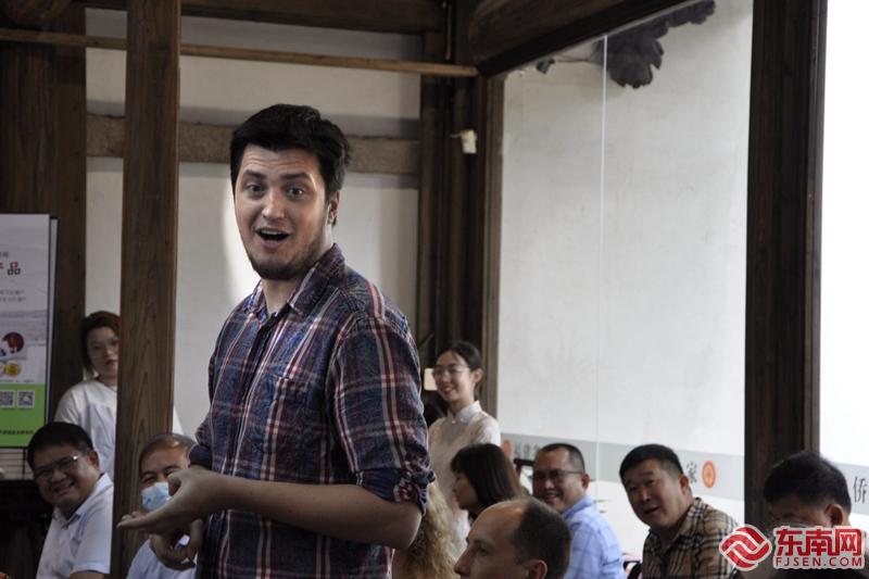 國際友人Oleksandr Iakimets(亞歷山大)分享異國風情的茶文化。吳隆重 攝