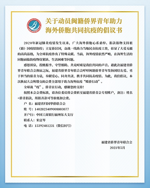 《關于動員閩籍僑界青年助力海外僑胞共同抗疫的倡議書》 東南網5月28日訊(本網記者 王文青)5月27日,來自五湖四海的僑青齊聚福州,參與2021年僑界青年奮進新時代主題論壇活動,積極響應《關于動員閩籍僑界青年助力海外僑胞共同抗疫的倡議書》。 當前,海外疫情依然嚴峻,在海外生活的僑胞面臨防疫物資緊缺、生活困難等問題。為此,福建省僑青會新一屆領導班子發出《關于動員閩籍僑界青年助力海外僑胞共同抗疫的倡議書》,將此次換屆繳交的會費用于捐贈購買防疫物資,助力海外抗疫“暖僑行動”,以體現作為僑青的責任和擔當。 福建省僑青會副會長、劍橋閥業集團公司董事長翁煌祥表示,唯有心心相連,方能共克時艱。此次所捐會費用于助力海外僑胞抗疫,昭示了福建僑青會對海外僑胞抗擊疫情的熱烈關切,更彰顯了中華兒女互為惦念的無價情誼與根植內心的無疆大愛。 來自德國的閩籍僑胞、福建省僑青會副會長盧賢坤表示,此次積極響應《關于動員閩籍僑界青年助力海外僑胞共同抗疫的倡議書》,是出于對省僑青會的信任,同時,自己也身處海外,看到了海外僑胞的困難和無助,希望有更多的僑青能投入到助力海外僑胞抗疫的隊伍中,幫助更多的海外同胞共克時艱。