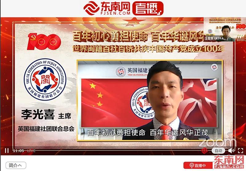 英國福建社團聯合總會主席李光喜出席視頻連線活動并致辭。吳隆重截屏制圖 李光喜代表主辦方致辭。他表示,國強則僑安,中國共產黨團結帶領中國人民實現了從 “站起來”“富起來”到“強起來”的偉大飛躍,中國的新征程為海外華僑華人提供更多事業的發展機遇,廣大僑界要發揮人才優勢,緊緊跟隨祖國的步伐,進一步弘揚中華優秀傳統文化,繼續發揮好中外友好的橋梁和紐帶作用,共同講好中國故事,講好中國共產黨的故事,向全世界展示一個真實而全面的中國,在融入新發展格局、助力高質量發展中發揮重要作用。 在發言交流環節,與會嘉賓慷慨陳詞,表達對中國共產黨成立100周年的深情祝福和為融通中外積極作貢獻的真誠意愿。