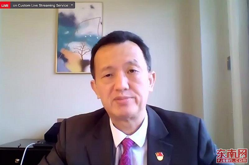 歐洲福建發展聯盟主席、英國福建社團聯合總會主席何家金致辭。 吳隆重截屏制圖 歐洲福建發展聯盟主席、英國福建社團聯合總會主席何家金認為,“十四五”是中國的新征程、新機遇,海外華僑華人要充分利用“雙向平臺”的優勢, 積極參與國際貿易市場開發,創新推進國際文化傳播,進一步參與促進國際多領域文化和經濟合作,實現互利共贏。