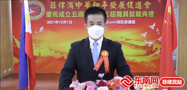 移交印信(菲律賓中華和平發展促進會供圖) 東南網菲律賓10月5日訊(本網特約記者 王丹鳳)10 月 1 日,菲律賓中華和平發展促進會(以下簡稱“促進會”)成立五周年暨第三屆理事會就職典禮通過網絡視頻舉行。蔡少煌任新屆會長。 中國駐宿務總領事館總領事賈力在線講話,勉勵促進會新屆職員為促進中華民族和平統一事業和菲中兩國共同利益和合作繼續作出貢獻。 中國僑聯副主席、福建省僑聯主席陳式海代表福建省僑聯發表視頻祝賀,勉勵促進會新一屆理事會,繼續凝聚僑胞力量,砥礪奮進再出發,書寫兩國睦鄰友好新篇章,為實現中華民族偉大復興作出新的貢獻。 促進會創會會長王永義擔任大會主席,副會長洪健雄為新屆職員監誓并主持交換印信儀式。