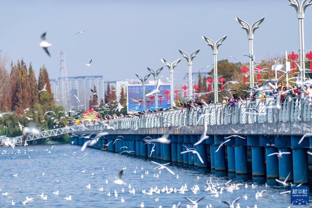 當(dāng)日,春城昆明天氣晴好。在滇池海埂大壩,成群的紅嘴鷗時而盤旋、時而嬉戲。