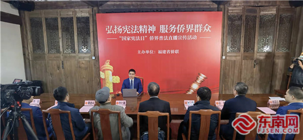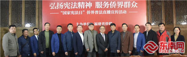 合影。 東南網12月4日訊(本網記者 王文青)12月3日下午,由福建省僑聯主辦的“國家憲法日”僑界普法直播宣傳活動在福州成功舉辦。福建省僑聯黨組成員、副主席翁小杰,省僑聯顧問律師、北京市盈科(福州)律師事務所高級合伙人鐘彬,福州市、鼓樓區僑聯和法顧委成員以及歸僑僑眷代表等近30人在線下出席活動,線上邀請海外閩籍社團參加。