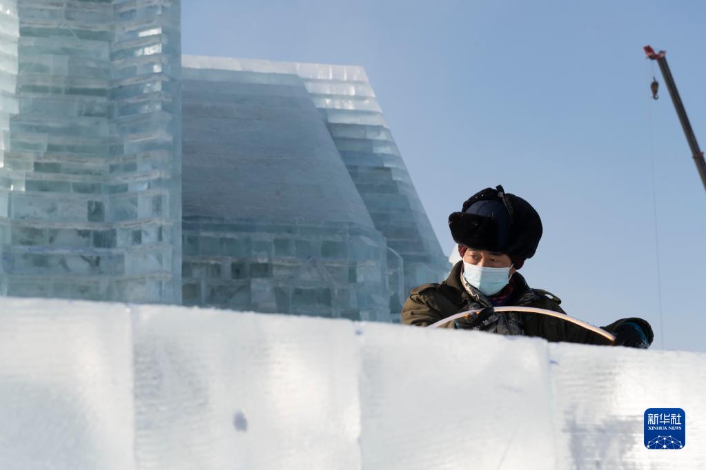 12月22日,工人在哈爾濱冰雪大世界園區施工。