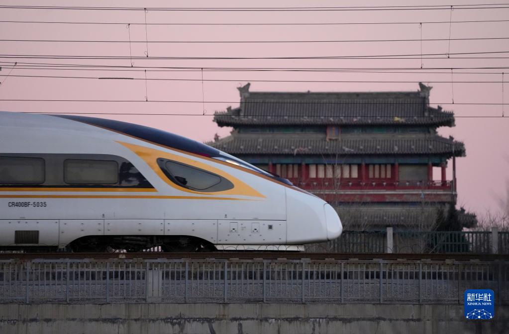 1月17日清晨,一列動車組列車駛過北京永定門城樓。
