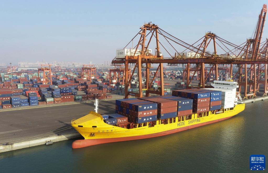 1月16日,一艘輪船靠泊在唐山港京唐港區集裝箱碼頭裝貨(無人機照片)。