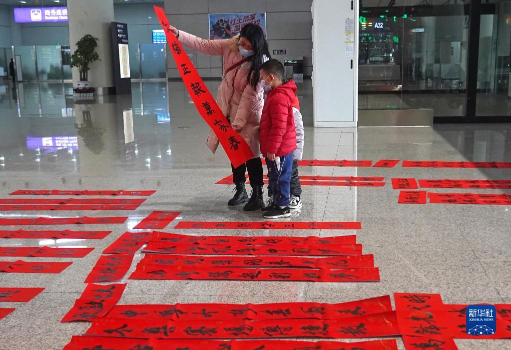 1月29日,旅客在南昌西站候車大廳挑選春聯。